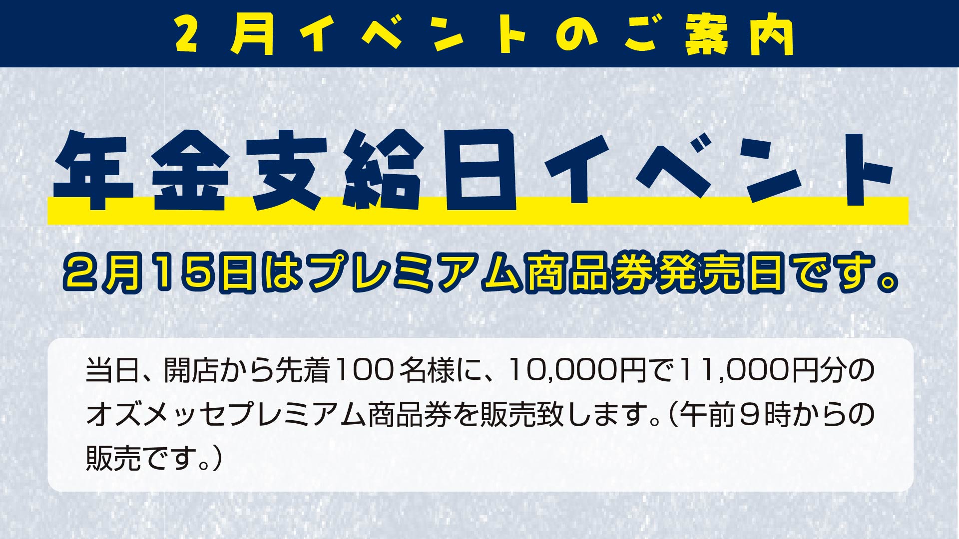 Pickup! 年金支給日・年金振込日のイベントについて 年金支給日がお得 年金支給日がお得! 特典…年金支給日には、10,000円で11,000円分のオズメッセ商品券を販売いたします。先着100名...